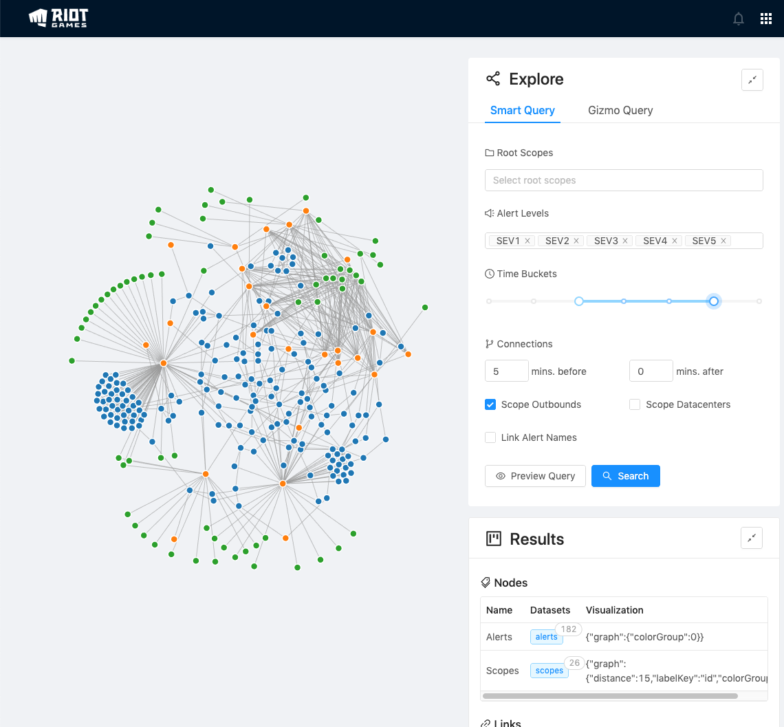 My second project leveraged a graph database to generate a visual representation of a sliding window of recently triggered alerts. Doing so allows engineers to ask questions about alerts based on relations. For example, how soon was alert A fired after alert B? Do they have a network dependency between them? Are they owned by the same team? Do they all happen to be in the same datacenter? The goal was to help engineers triage the root cause of issues that might cause a cascade of alerts across Riot’s microservice ecosystem through a flexible visualization tool.