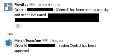 The Slack bot was one of the first projects completed during my internship, and was super fun for me as it introduced me to the Slack API. I was tasked with creating a bot to help automate some of our internal systems for marking and processing potentially fraudulent orders. Previously, our player support agents would have to manually approve any order that was marked as potentially fraudulent via our ecommerce backend portal, which could be a bit tedious. To make things easier for the agents, we first set up a service that automatically sends messages to a specific Slack channel whenever our system marks an order as potentially fraudulent. Then, a player support agent checks the order info from that message, and if the order is not fraudulent all they have to do is react to the message with a specific Slack emoji. My Slack bot monitors this channel for emoji reactions, and whenever that specific reaction is made on a message, it parses out the relevant order info from the message text and makes an API call to our ecommerce service to mark the order as safe to fulfill. This saves the PS agents a lot of time and ensures that they don’t need to worry about sending API calls themselves.