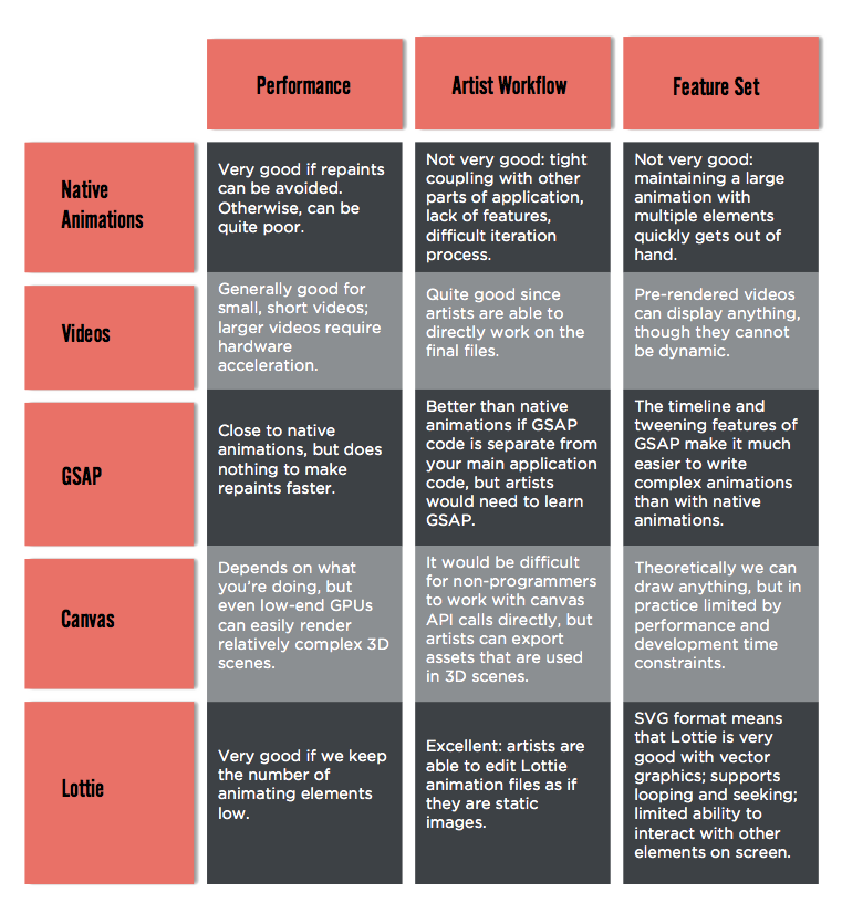 It’s also important to consider workflow when choosing a technique. Complex native animations often result in a jumble of brittle code. Adding a library like GSAP or using pre-rendered videos simplifies the creation and maintenance of this code greatly. The Lottie library also shows promise since it allows artists to work with browser animations without working with code. Here’s a handy comparison of the five techniques we’ve covered: