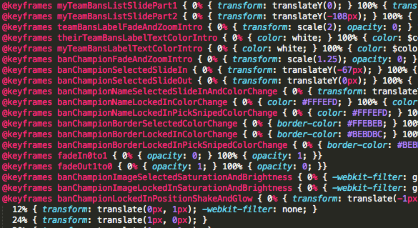 Most web developers have used or at least heard of CSS animations or transitions, which are straightforward ways to tween between two or more keyframes. These are used extensively throughout the client, for both simple cases, like a single element fading in or out, and much more complex situations, like the animation used at the end of the ban phase in champion select: