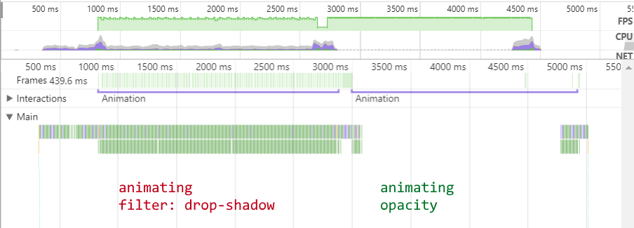 We can do a lot with just those two properties. For instance, if we wanted to animate a shadow fade on text, instead of animating text-shadow or filter (which would result in more expensive repaints), we would duplicate the original element, apply the full text shadow to it, and fade it in and out. The resultant profile shows no CPU overhead with animating opacity, unlike animating filter: