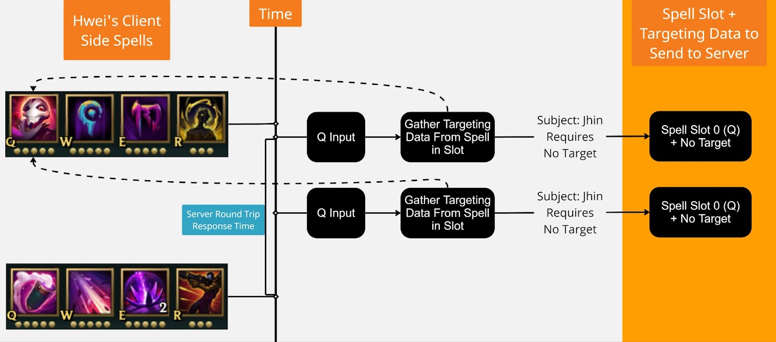 Let’s concoct a goofy hypothetical example to explain the issue here. Say Hwei has “Subject: Jhin” as a spell that swaps his spells to Jhin’s spells. Hwei casts “Subject: Jhin” and then Jhin’s Q spell, “Dancing Grenade”, which is a targeted spell. The subject spell has to do a round trip before it actually changes the spells on the client, sending the spell cast packet to the server which then replies with the spell changes on the client. If a player client casts Jhin’s Q before the round trip finishes, we would actually still have the subject spell in the spell slot, which doesn’t require a target with its spell cast. This means if we try to queue up Jhin’s Q before the round trip returns, the spell cast wouldn’t have a target, which would inevitably cause issues once the malformed spell cast packet gets sent to the server.