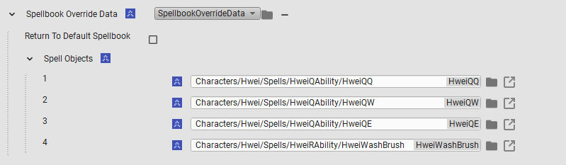 The “Spellbook Override” system is designed to be reused by future champions and creatures in the game. The idea is designers just need to specify the data of the spellbook , for example: