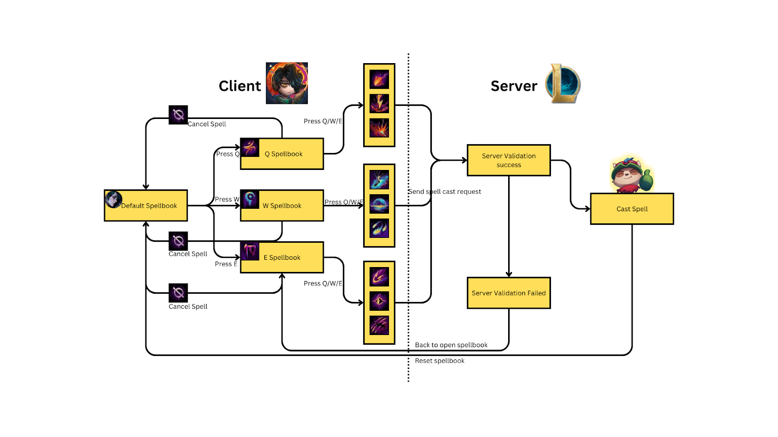 Now that we’re equipped with the knowledge of how the spellcasting system works. Let’s talk about the MVP (Minimum Viable Product) for the client-side driven solution Hwei uses to cast his spells, or as we call it, the “Spellbook Override” system.