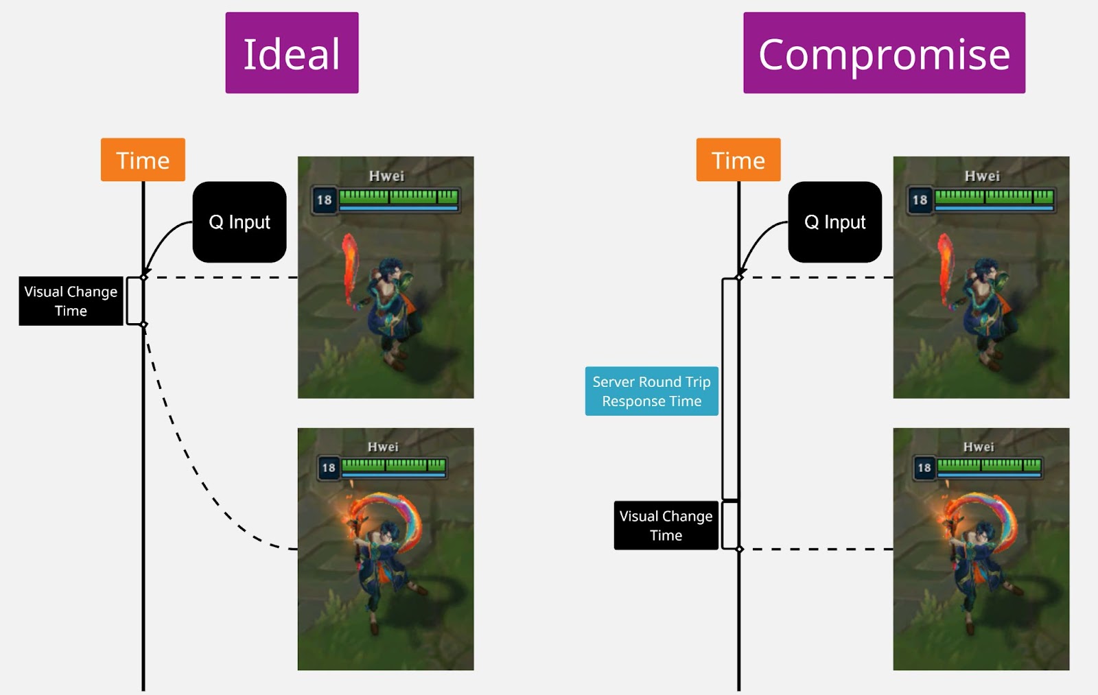 While it wasn’t optimal, if we interpret this “faking” as a spell cast (which it was previously), it was very much in line with what any other champion would do. For any champion, after a player’s initial input for a spell cast, a round trip packet would have to happen before their champion plays associated spell cast visuals. If we make comparisons with this in mind, rather than with the optimal solution, the tradeoff cost was next to negligible.