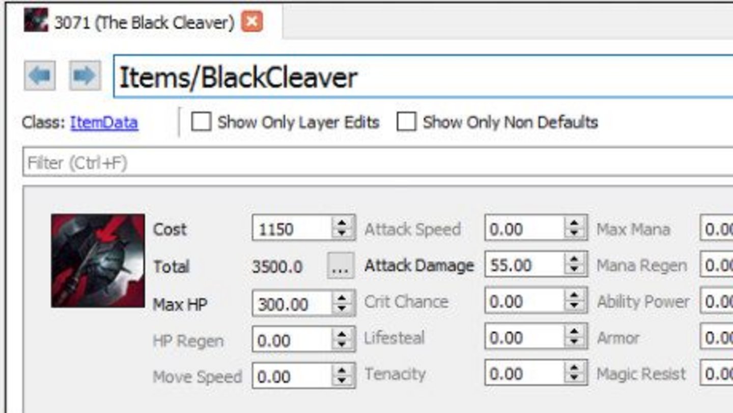 GDS property data lives in a folder appropriately named PROPERTIES. This folder will eventually contain all of the property data for League of Legends. When a tool needs to identify the specifics of what makes Black Cleaver into Pantheon’s favorite weapon, it issues an HTTP request to localhost:1300, where the GDS is listening. When a request is made to “get?path=Items/BlackCleaver”, GDS looks up the file at PROPERTIES/Items/BlackCleaver.json. Here’s what that response looks like: