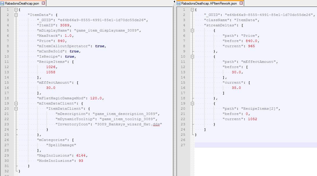 Afterwards, GDS tags any changes made to any file as part of the APItemRework layer. On disk, this looks like one file called RabadonsDeathcap.json, and next to it another file called RabadonsDeathcap.APItemRework.json. In that second layer file, GDS simply marks the delta of each field that has been changed. The before and after values are saved to reconcile merge conflicts later. Here’s a side-by-side view of what these two files might look like:
