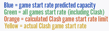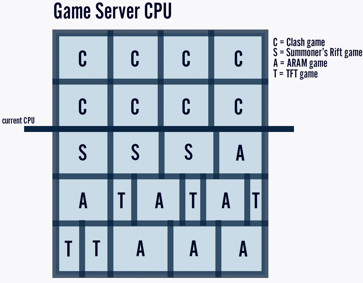 But capacity calculated this way was underestimating the true capacity, because ARAM and TFT games were being counted as if they required the same amount of CPU as games on Summoner’s Rift (where Clash is held), even though they take significantly less power. In other words, we could actually safely handle more games than this calculation initially indicated. This extra 10-20% buffer meant the Clash game start rate at peak was much lower than we could actually handle, meaning players would have to wait much longer than necessary for their turn. By manually overriding calculated values, we were able to squeeze out all the available capacity.