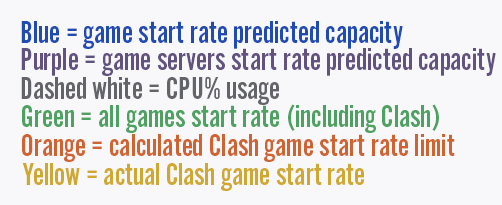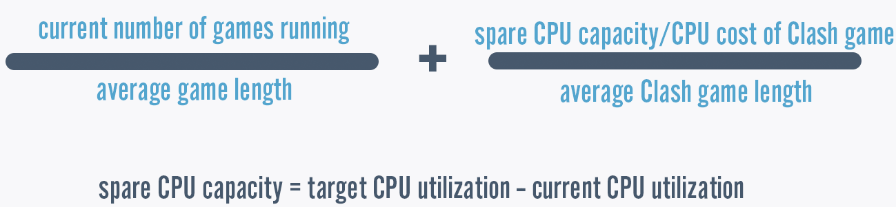 The formula was ultimately simple - current number of games running divided by average game length plus spare CPU capacity divided by CPU cost of Clash games divided by average Clash game length. Empirical results showed us that this metric has higher errors at low CPU load, but becomes very precise at high CPU load - which is the critical time to get things right. In other words, the closer we get to the danger zone, the more exact our numbers are.