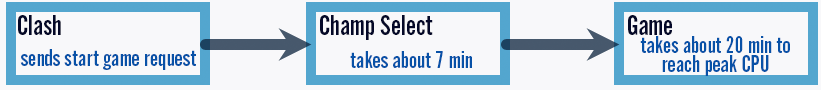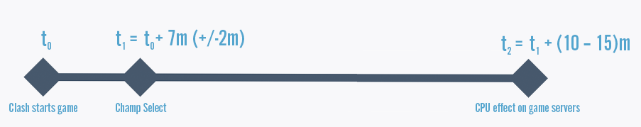 When Clash submits a game to start, it takes several seconds to initiate Champ Select, and Champ Select itself lasts around 7 minutes on average. The game then travels to the game servers, and then after approximately 10-15 minutes (of early game, which doesn’t take much power), we start to see teamfights, which take the most CPU. We need to optimize for this large CPU usage which only happens around 25 minutes into a game, so any changes made to the Clash system to protect the infrastructure from overload take significant time to propagate and take full effect. This means any solution we came up with would need to take this delay into account to avoid stressing downstream components beyond their capacity.