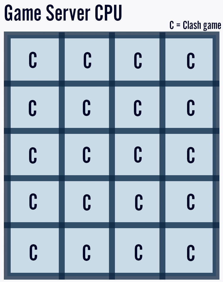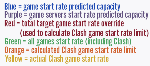 To do this, we started with a simple approach of dividing the target CPU% by the average CPU% that a game uses. We applied this number to all game servers based on hardware, and summed them up to obtain the total number of Clash games we can run on all servers. We divided that by average game length, and voilà - we had our initial safe game start rate per minute.