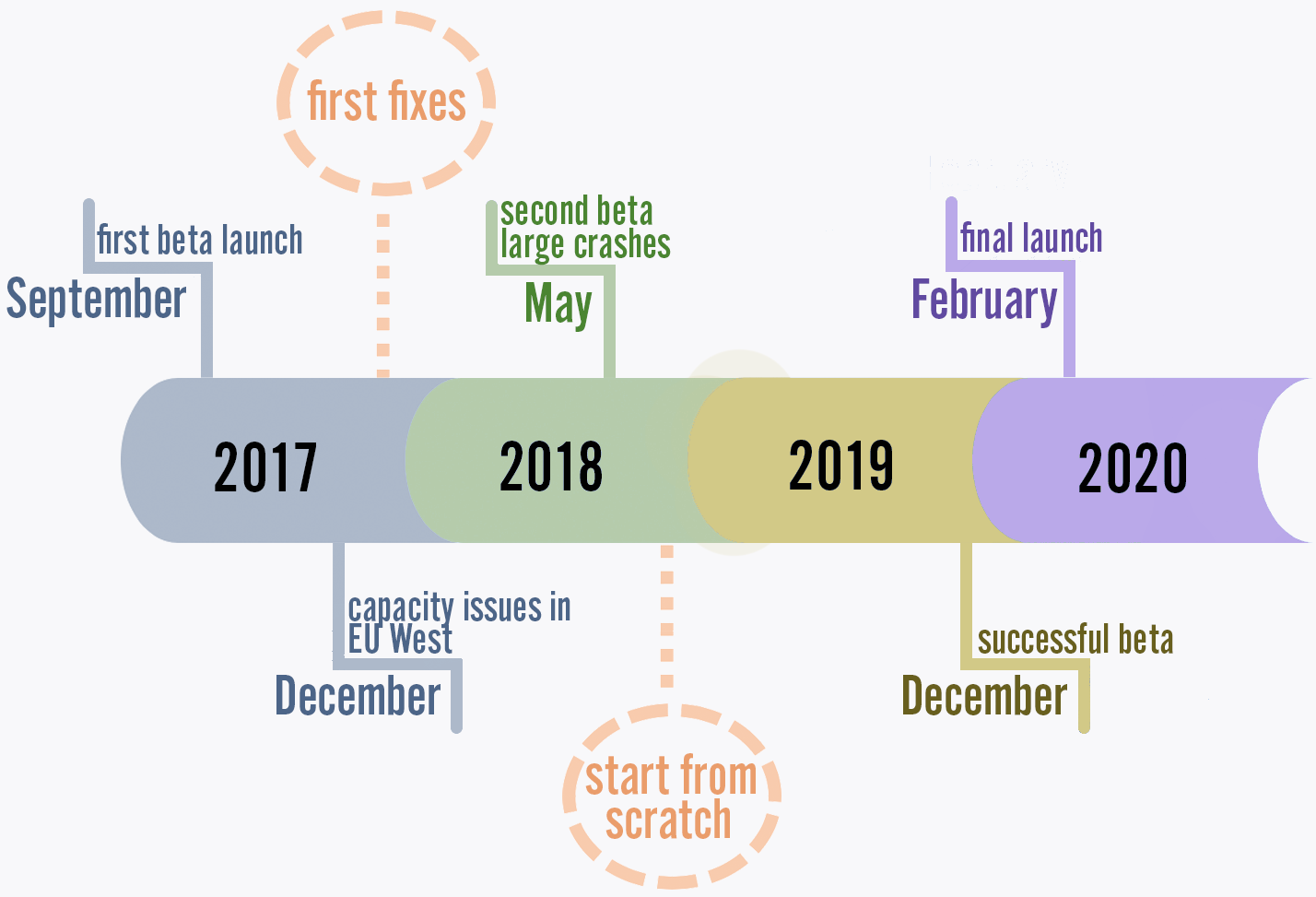 Our first beta in September 2017 in Vietnam went really well. We were thrilled to see how much players loved playing Clash, and we identified some small fixes and adjustments to improve the experience. After these improvements, we decided to launch in Europe in December 2017. This launch was less successful. EU West pretty much instantly ran into capacity problems, which was our first indication of scalability issues.