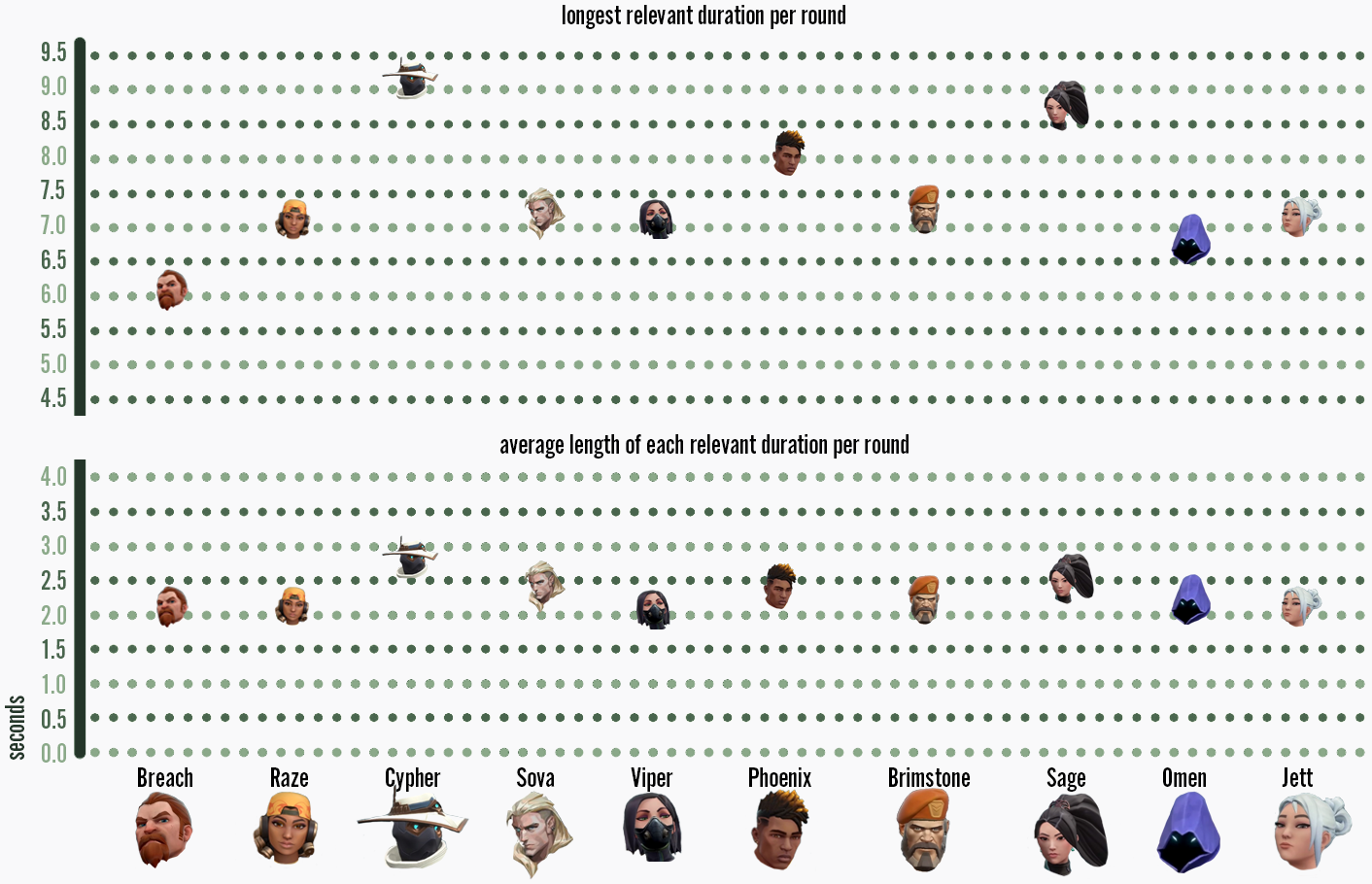 With this telemetry I have the ability to set alert thresholds to make sure I notice when a new piece of content or a system change impacts Fog of War. For example, if one Agent is listed as “relevant” far more often than the others, I’ll be alerted and can investigate to see if there’s a bug with any of their abilities. One situation like this was a bug where Jett’s Updraft ability played a sound that would get stuck playing in a loop (though inaudibly). It showed up in this telemetry as a significantly higher relevancy time for Jett players.