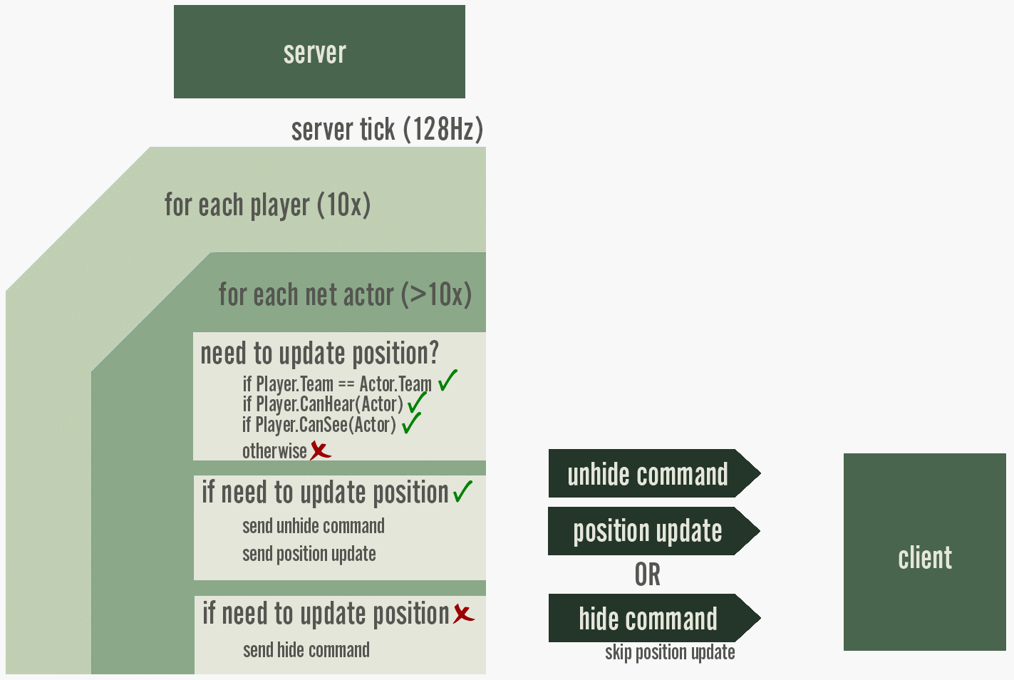 When marking an actor as not relevant, the server sent a message to that player to mark the not relevant actor as invisible and intangible (since they’re at an obsolete position and showing them would be misleading) and eventually despawn them. When the actor became relevant again, it would send a message to spawn them (if necessary) and then make them visible and enable collision.