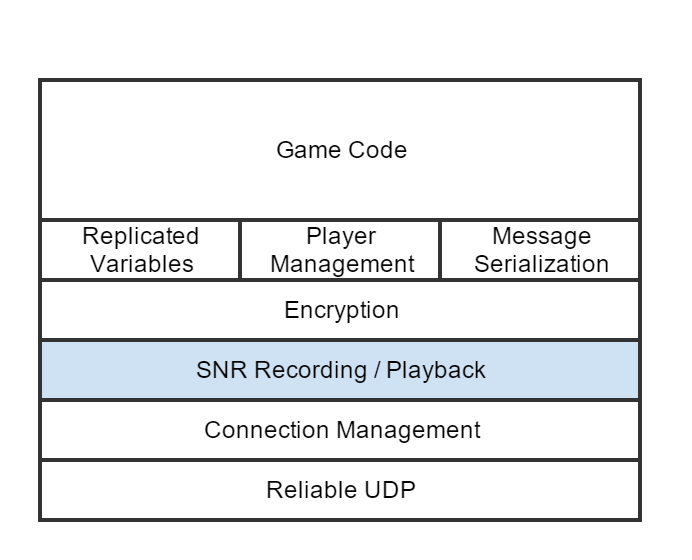 A critical simplification that we made up-front was that SNRs would record and play back the state of the game a single frame at a time. This led to numerous conventions and simplifications that allowed us to deliver gameplay server determinism in a reasonable amount of time.