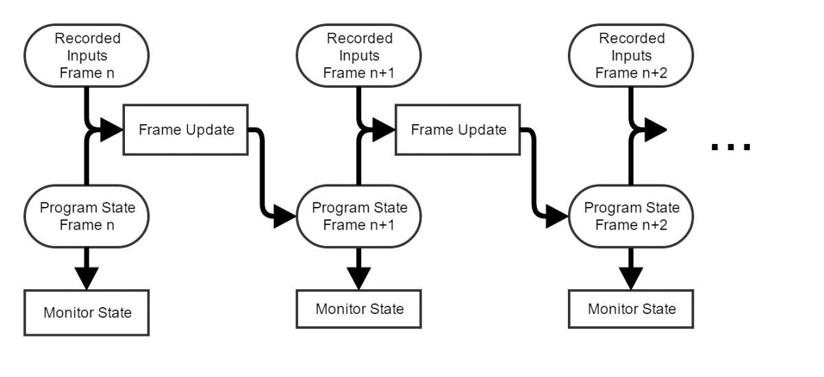 The above is what the execution flow looks like. Quantization of the game simulation is a convenient way to create entry points for monitoring, playback, and recording within the game loop. It also means that temporary state during the frame update does not necessarily need to be 100% deterministic, which saves a huge amount of time trying to fix divergent execution within code blocks that have no long-term consequences.