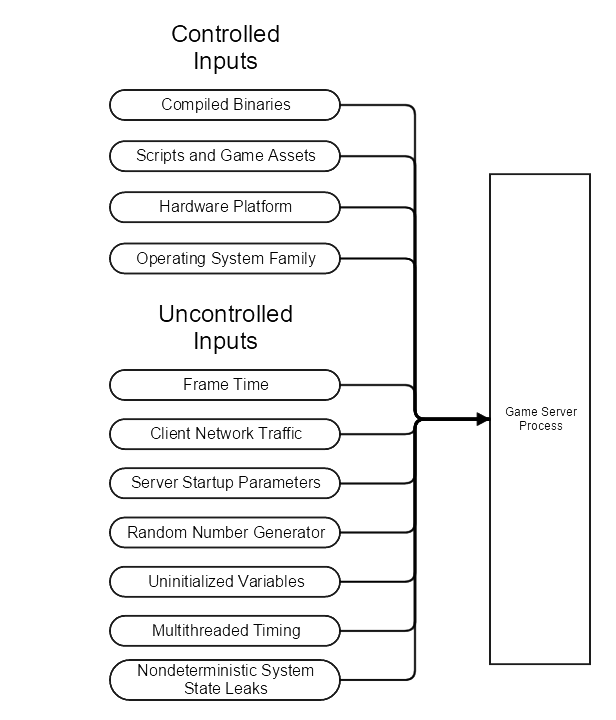 We started by organizing the well-understood categories of inputs into lists: controlled and uncontrolled. Controlled inputs are easy to understand: they are inputs that never change between executions of the same game version. Uncontrolled inputs describe any input into the LoL server that was either noisy, random, or generated from player inputs.