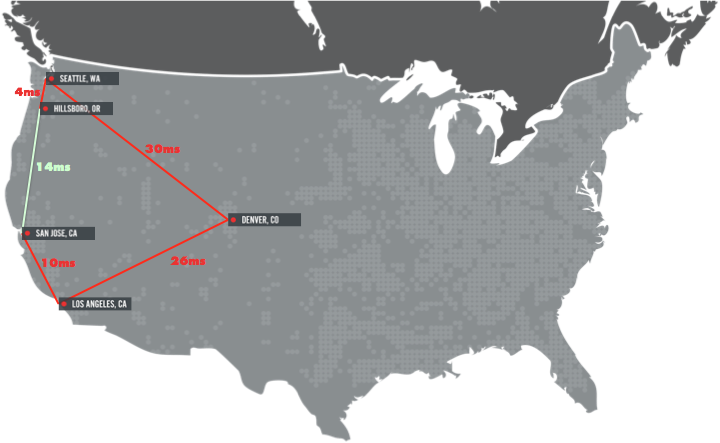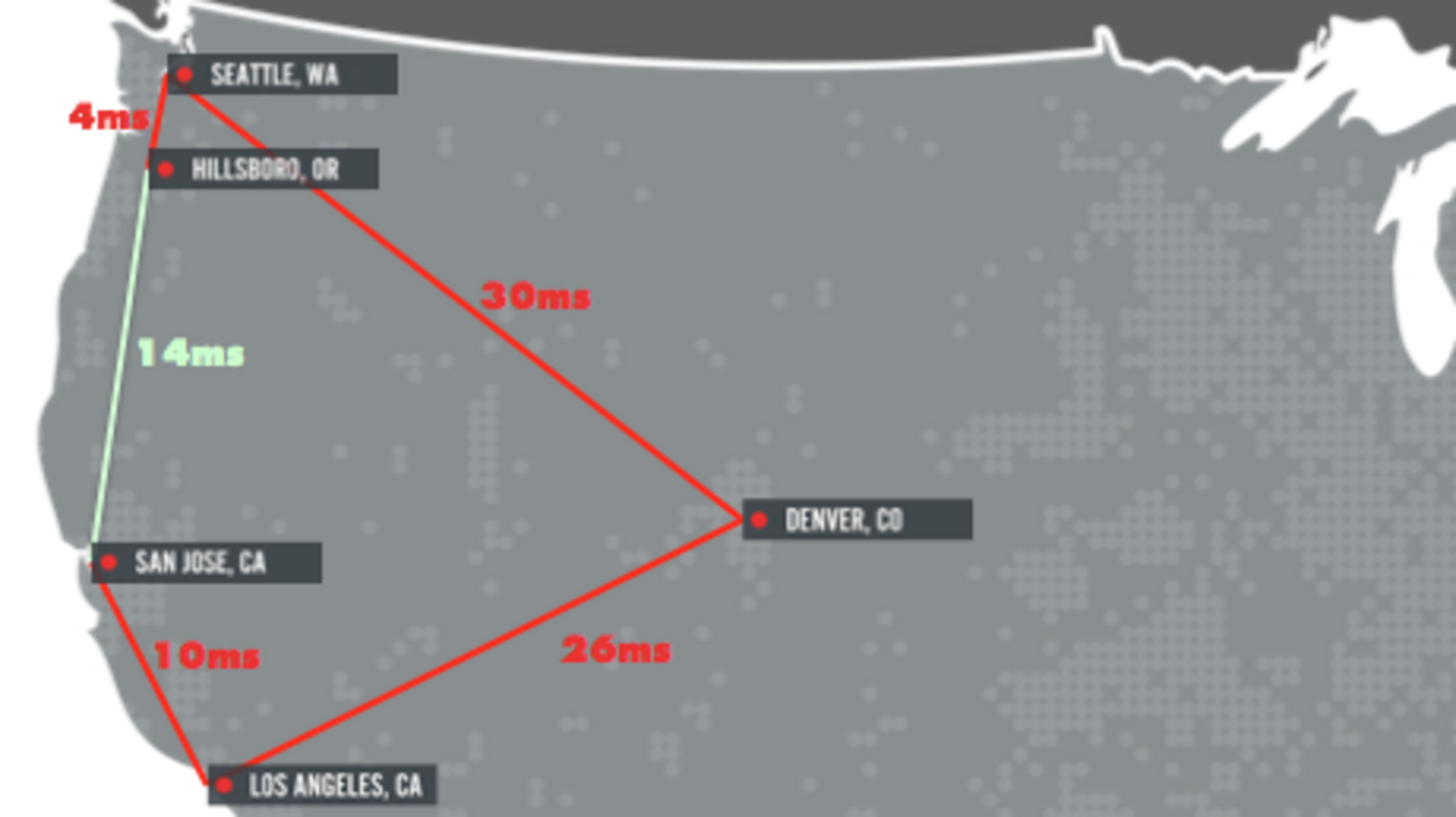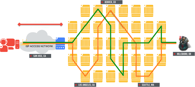 As an illustration, consider a real traffic flow submitted by a LoL player, shown below, that should travel directly between San Francisco and Portland. Instead, it bounces around from San Francisco to Los Angeles, then Denver, then Seattle, and only then to the final destination of Portland. A direct trip may have taken 14ms, but the less efficient route takes a full 70ms. That’s a brutal 500% increase. To the ISPs and their backbone providers, this is acceptable—but not to games like LoL.