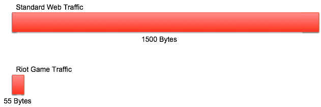 The vast majority of internet traffic breaks down into packets of 1500 bytes in size: consider these the tractor-trailers of the internet as almost every picture, movie, or song transmitted online is sent using packets exclusively of this size. (This 1500 byte payload is a result of the Maximum Transmission Unit of Ethernet version 2. Interested readers can investigate the actual framing here.) In stark contrast, game traffic is usually around 55 bytes in size. Games require constant updates but any individual message is quite small. While Netflix sends a significant amount of information about the next high-resolution video frame, the entirety of a LoL message might be the location of a player’s right-click of the mouse.
