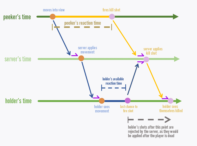 Similarly, when the peeker fires the killing shot, the holder won’t see it until the information follows that same path. When the server processes a lethal shot, it marks the victim as dead, rejecting any future shots from that victim. For the holding player to win the engagement, they must send up a shot with enough time to travel to and be processed by the server before the lethal shot from the peeker is processed. This creates a short window where the victim doesn’t know they’ve been killed and may fire shots that won’t count.