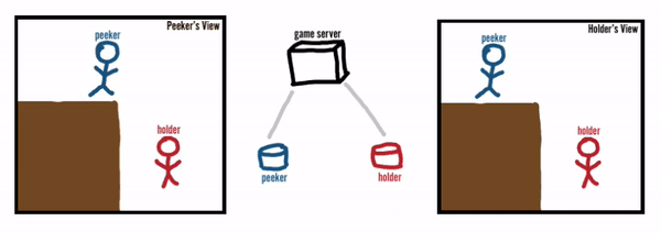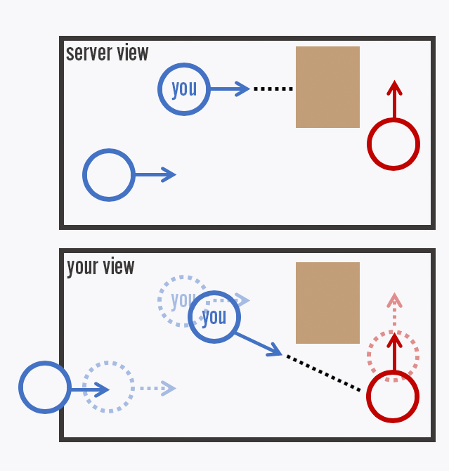 The peeking player can see the holding player as soon as their computer processes their input and predictively moves them around the corner.