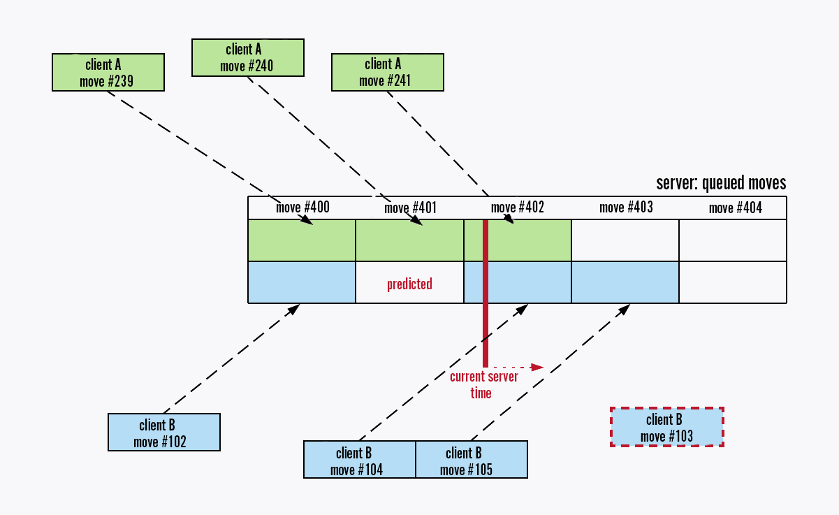 Remember the network buffering we referred to in the peeker’s advantage discussion? Here’s where it comes in. The server sets up its basis (and adjusts as needed) to maintain a healthy queue of upcoming moves to execute. As mentioned above, we keep this queue as short as possible to minimize latency but long enough to smooth over the uneven rate at which the updates arrive.