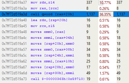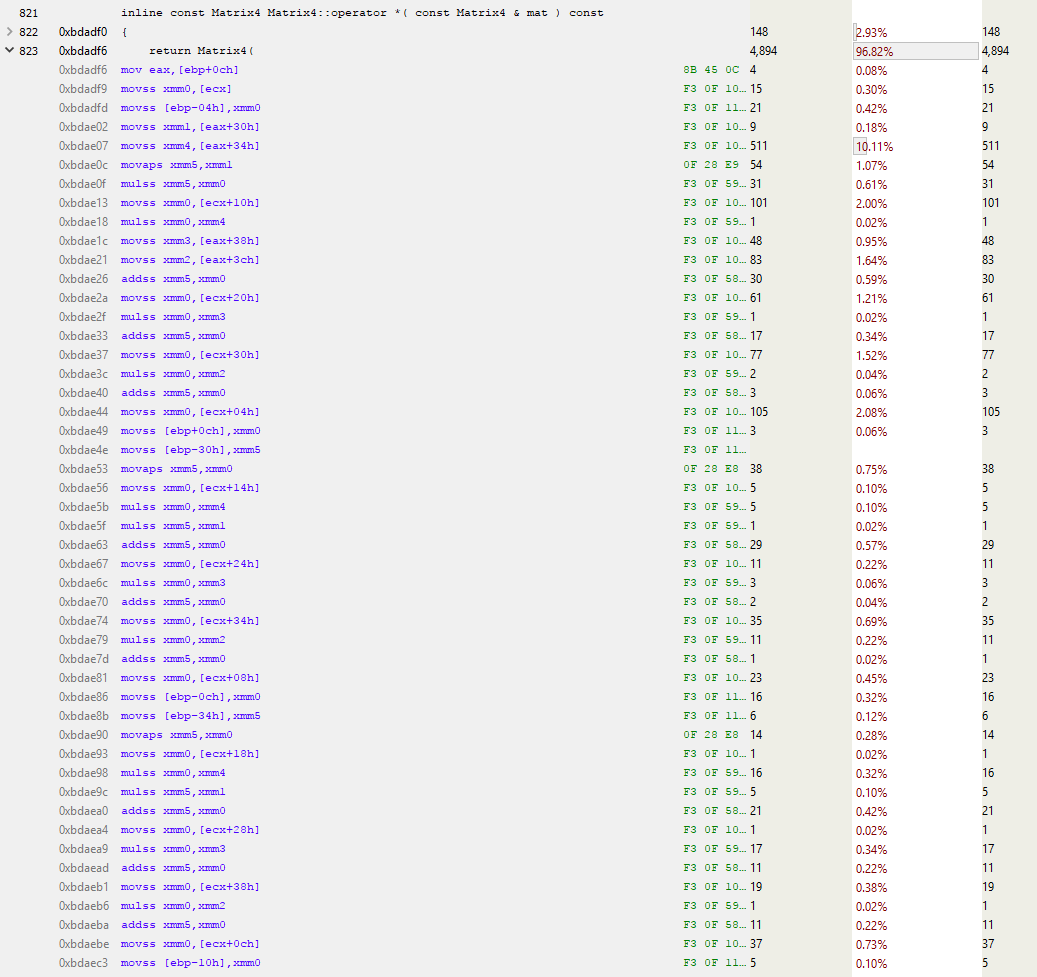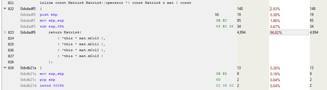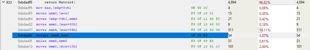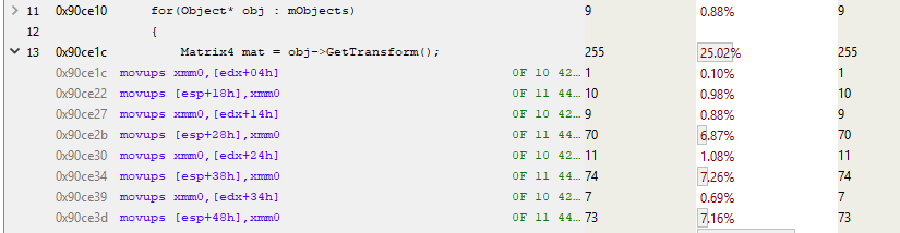 In this fragment, edx is the location of the Object, and as we know, 4 bytes from the start of the object is where mTransform starts. So this code is copying mTransform to the stack (MOVUPS copies 4 unaligned floats to a register). Note the 7% hits for the last 3 MOVUPS instructions. This indicates that the cache misses are equally spread amongst those MOVs. I’m not sure why the first MOVUPS to stack isn’t as costly as the others. I *think* what is happening is that the cost is being deferred to the subsequent MOVUPS due to the magic of instruction pipelining (if you know why, please let me know in a comment). Regardless, what we’re seeing here looks like evidence of costly memory access, so we’ll run with that.