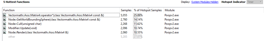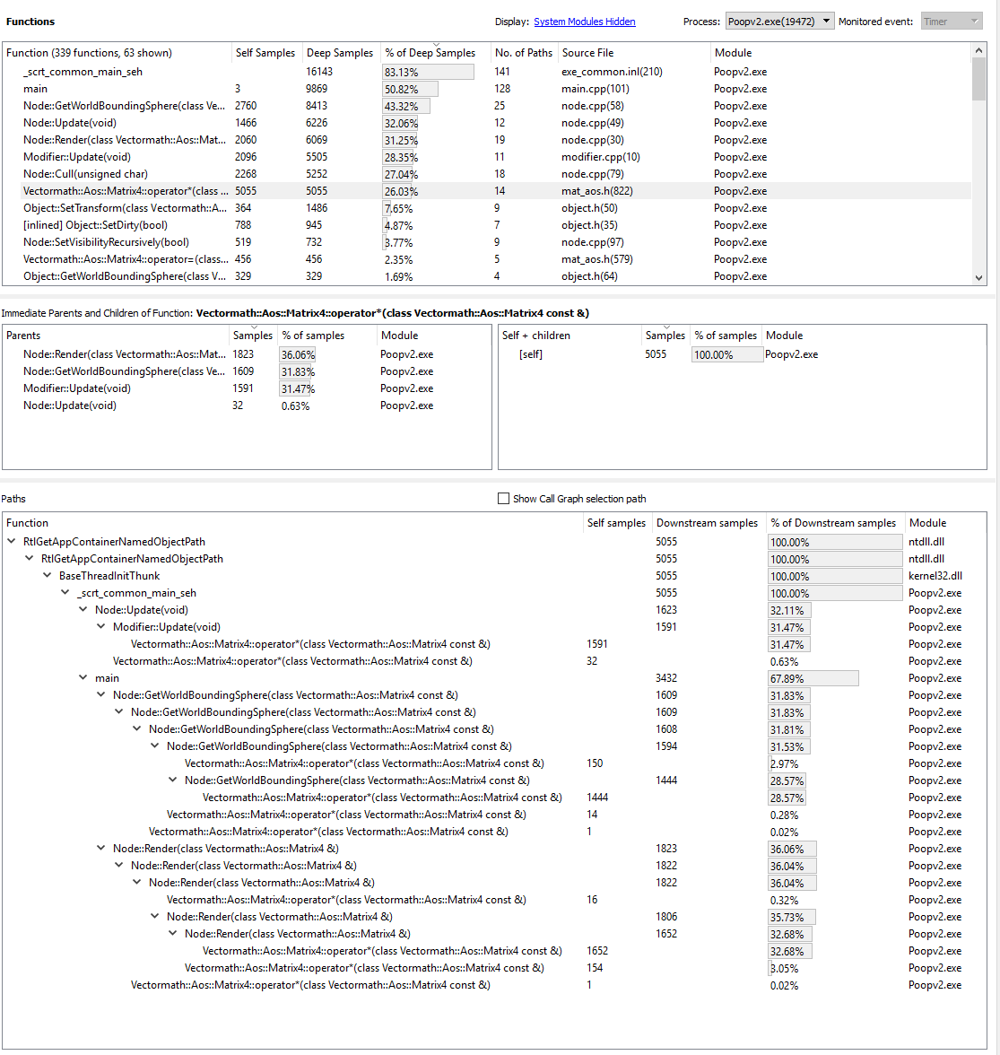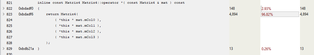 Looks like the matrix multiply is the slowest function. That would make sense, as it’s doing a lot of number crunching to perform all those rotations. If we look closer at the stack hierarchy two images up, you’ll notice that the Matrix multiply operator is called by Modifier::Update(), Node::Update(), GetWorldBoundingSphere(), and Node::Render(). Given that it’s called so frequently and from so many places, it looks like a good candidate for optimisation.
