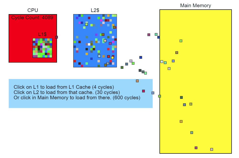 An L3 cache miss takes well over 100 cycles (hundreds in some cases), while an L2 cache miss takes about 40 cycles, though both depend heavily on the CPU hardware. By comparison, x86 instructions vary from 1 cycle to around 100 with most being less than 20 cycles (some divide instructions on some hardware are quite slow). With the Core i7 I’ve tested on, multiply, add, and even divide are on the order of a few cycles. The instructions pipeline, so multiple instructions are in process at the same time. This means a single L3 cache miss - a single load direct from memory - can take as long as executing hundreds of instructions. Quite simply, reading from memory is very slow.