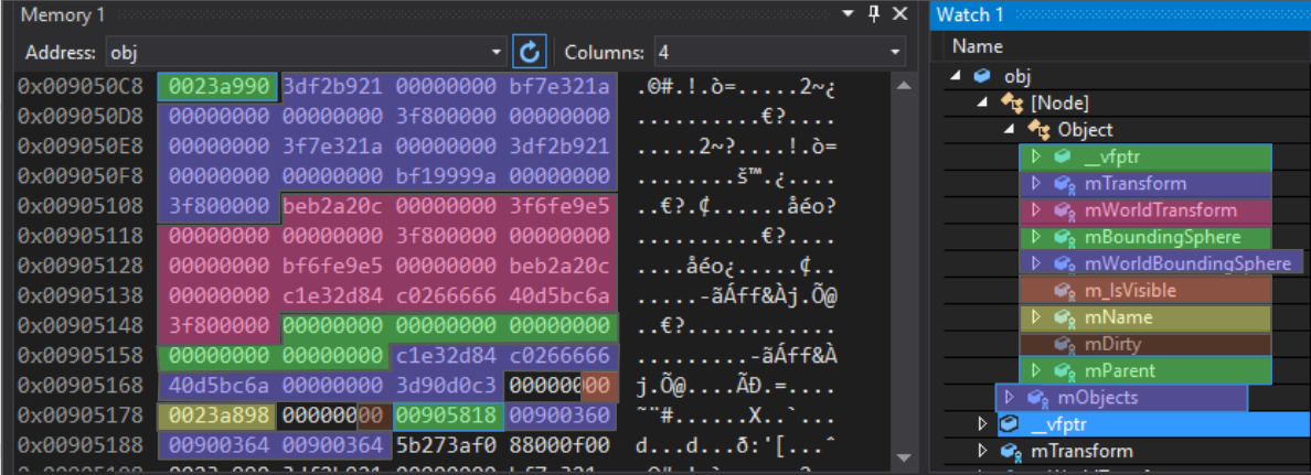 From the top, the first entry is the virtual table pointer. This is part of the C++ inheritance implementation. It’s a pointer to an array of function pointers which serve as the virtual functions for this particular polymorphic object. There’s a different vtable for Object, Node, Modifier, and any class inherited from the base class (we’ll see this in more detail in a future article). After this 4-byte pointer there’s a 64-byte array of floats; the matrix mTransform, followed by another matrix mWorldTransform and then two bounding spheres. Note that the next entry, m_IsVisible, is a single byte but takes up a full 4 bytes. This is normal, as the next entry is a pointer and needs to be at least 4-byte aligned. If we had put another boolean next to m_IsVisible, it would have packed neatly into the available 3 bytes. The mName pointer is next (4-byte aligned), then the mDirty boolean (also badly packed), then a pointer to the parent Object. That’s all of the Object-specific data. The mObjects vector after that corresponds to the Node-specific vector and is 12 bytes on this platform, though it can be a different size on other platforms.