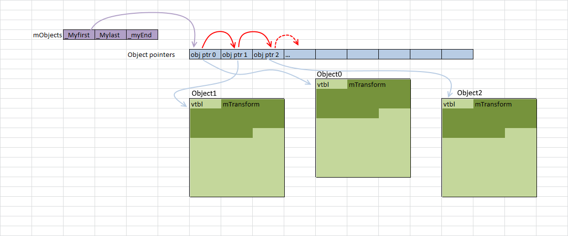 {Firstly, the mObjects vector is an array of pointers to Objects which are dynamically allocated. Iterating through that vector is cache-friendly (the red arrows below) as each pointer is just after the last one. There are few cache misses there, but what they point to is probably not cache-friendly. Since each Object has been allocated with new, all we can say is that it’s somewhere in memory.