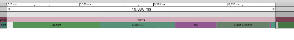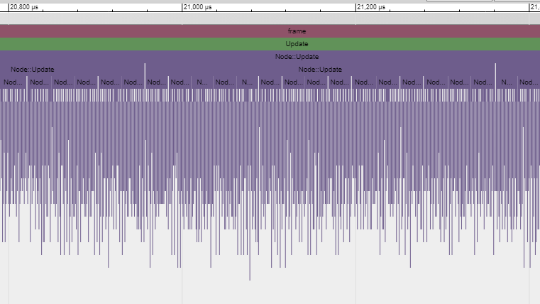 This is the view of one frame. We can see the relative duration for each of the function calls above. Note that we can also see the calling order. If we’d instrumented the functions that these functions call, we would see them directly under the bar that corresponds to the parent function. As an example, I’ve instrumented Node::Update() and we can see the recursive structure of the calls below: