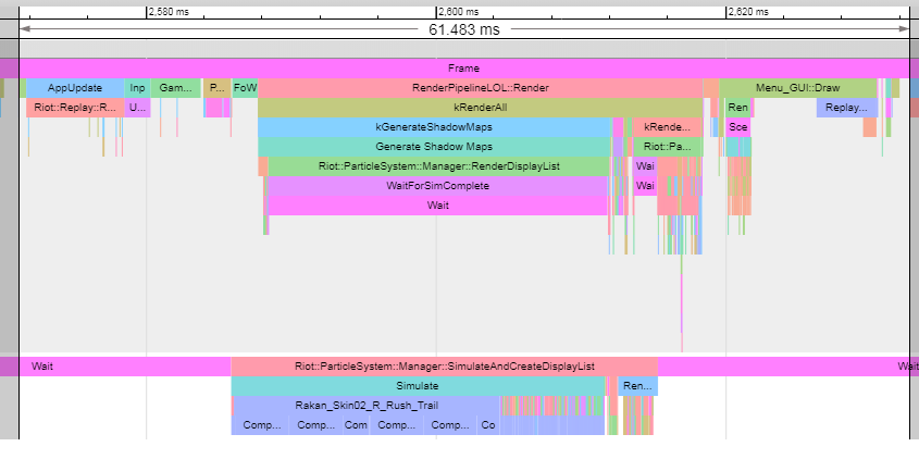 The top graph corresponds to the main thread of League. The bottom graph is the Particle Simulation thread, where a lot of the particle work happens in parallel. The longer the coloured function block, the longer the function is taking to execute. The cause of the performance degradation is obvious now. Rakan_Skin02_R_Rush_Trail - Sweetheart Rakan’s ult (in dark blue) was causing the slowdown. The question was why?