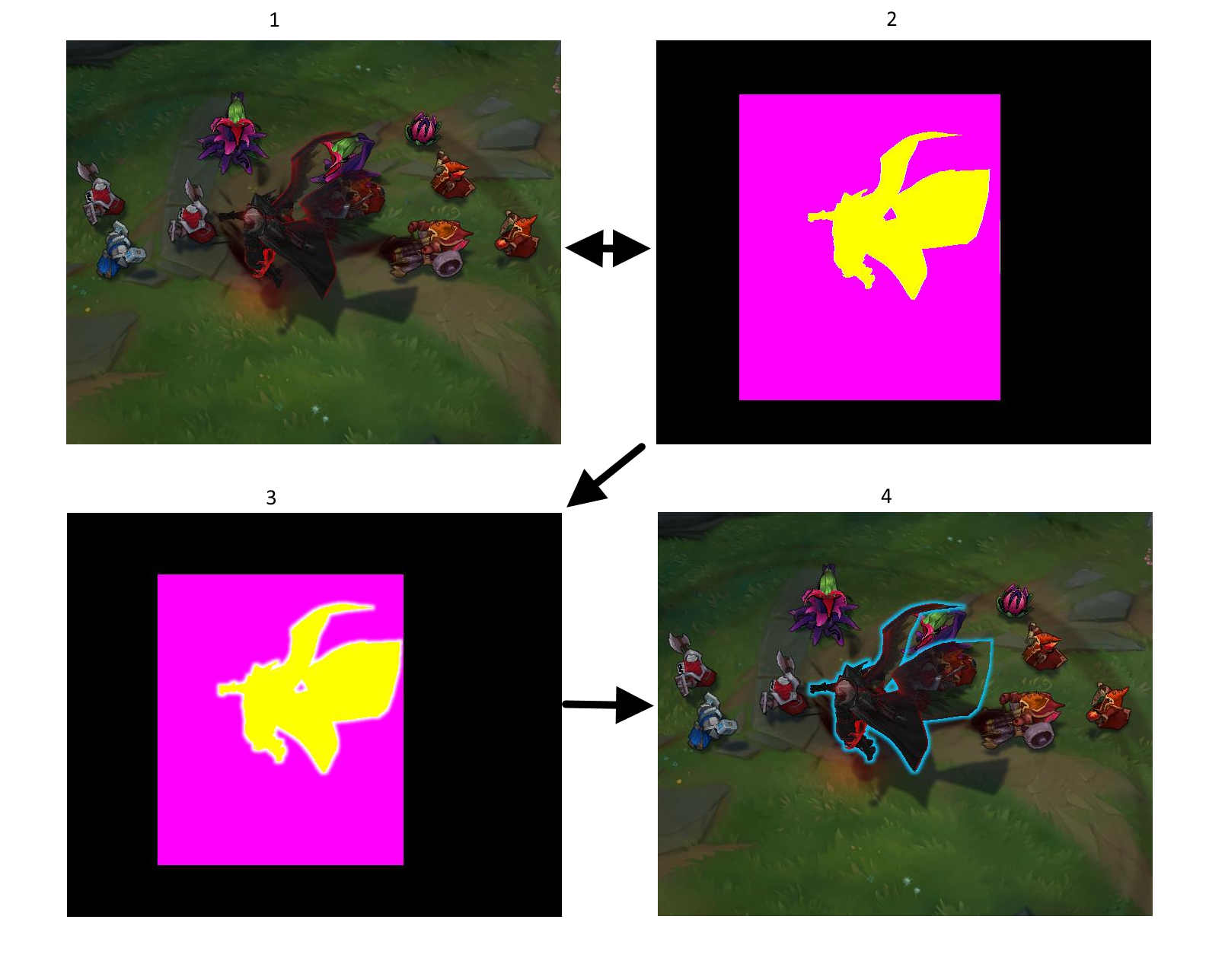 The slowdown was triggered whenever a player hovered their mouse over an enemy Swain, but not when a player was playing as Swain. The difference here is that we draw an outline when a player hovers another player’s champion for clarity. The image below shows how outlines are rendered. As a champion is rendered to the main frame buffer, a single colour version of the champ is also rendered to a secondary, offscreen buffer using multiple render targets (steps 1 and 2). The single colour mask is then blurred (step 3). This process is fast on high spec machines, but on lower spec machines it can be quite expensive (this is why shadows are expensive on lower spec machines as well). The cost of this blur is per pixel, so the more pixels blurred, the more expensive the effect. To minimise this cost we use a bounding box to limit the champion’s bounds and blur just within that region (the magenta box). We then use the blurred texture in the offscreen buffer to render an outline on the champion (step 4).