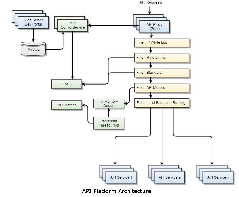 As mentioned in our previous article, we initially looked into using existing API management platforms, such as apiGrove and Repose, but decided to build our own solution that could be customized to work for all the different regions, partners, and technologies in the Riot Games ecosystem. After doing some research into what open source solutions were available to support traffic at our scale, we decided to utilize the Zuul proxy server developed by Netflix, as well as some other Netflix projects, including Archaius, Ribbon, Hystrix, and Eureka. The smart and talented folks at Netflix built their infrastructure to handle an enormous amount of constant, high-bandwidth traffic, so we knew we could trust that the code was battle-tested and production-hardened. Netflix Zuul provides a core JAR dependency that handles HTTP requests and executes filter chains. Using this dependency as a basis, we wrote some additional classes to include features we needed, such as automated health checking, connection pool management and monitoring, metrics processing, etc. On top of this core proxy server, we implemented custom filters to handle things like authorization, authentication, rate limiting, dynamic routing, load balancing, metrics collection, white listing, black listing, and more. The core proxy server, written in Java, and custom filters, written in Groovy, are built into a WAR and deployed in production running in the Jetty servlet container. Additional components of our core architecture, which our Zuul proxies talk to, are separate services that handle rate limiting, black listing, and metrics collection and processing.