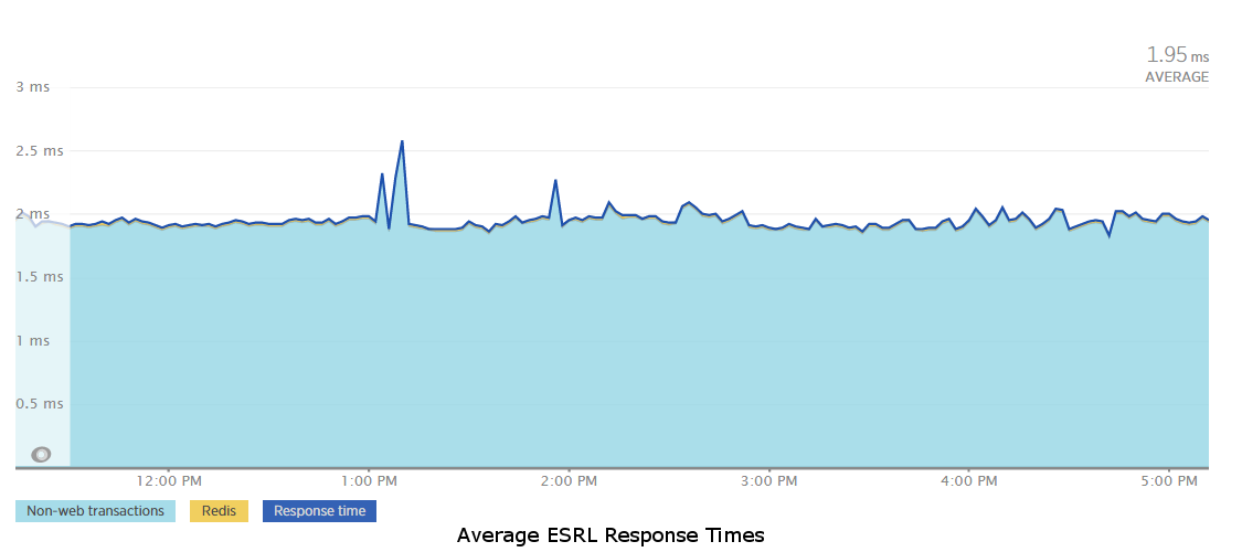 The Edge Service Rate Limiter (ESRL - pronounced Ezreal) handles the rate limiting and black listing functions. It provides two endpoints, one that uses something similar to a leaky bucket algorithm to manage rate limits for API keys, and one that checks if an API key is blacklisted based on the number of rate limit violations it has incurred over a given period of time. A goal with ESRL was to keep the response times incredibly fast so that we didn’t bottleneck our requests while trying to do rate limiting management. We achieved that goal with both of these endpoints having response times that average under 2 ms, as shown in the graph below, by using Redis for all of the ESRL’s operations. Each endpoint runs a Lua script in a single call to Redis to execute all the desired operations in one connection, and then uses the script response to determine what to return to the client.
