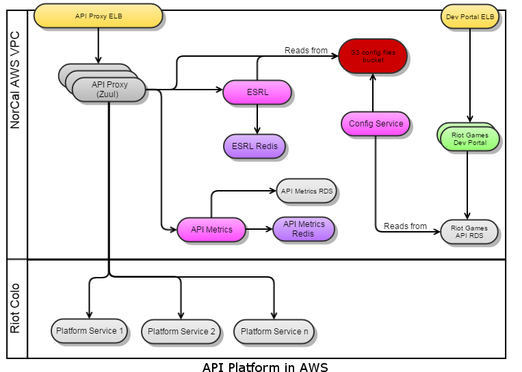 The Zuul proxy servers are deployed on AWS instances across 3 VPCs in Tokyo, Ireland, and NorCal. There are 4 proxy server instances, 2 in each availability zone in each VPC behind an ELB. Each VPC also has a set of instances for the Riot API Metrics and ESRL that the Zuuls in that VPC utilize. The Riot API Metrics and ESRL also each use their own Redis, an AWS ElasticCache instance, in each VPC. The Riot API Metrics in NorCal is considered the metrics “primary” and is backed by a MySQL database, an AWS RDS instance. The Riot API Metrics in Ireland and Tokyo are considered “replicas” and when their threads execute the persistence step to save the metrics data, they do so by making a REST call to the primary with the DTO serialized into JSON. The primary then saves the data to the database. This model allows us to save all metrics data from all regions into a single database that we can query against. When the primary executes the persistence step, it saves the DTOs directly to the database. The API Configuration Service runs only in the NorCal VPC and writes the necessary files to S3 buckets in all regions. Each Zuul and ESRL reads from the S3 bucket in its own region to reduce latency.