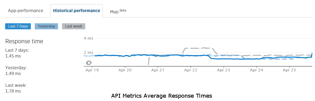 The Riot API Metrics service handles metrics collection and processing. As with ESRL, we wanted to make sure that metrics collection did not bottleneck our requests. To aid in that goal, we decoupled the real-time metrics collection from synchronous HTTP requests to Zuul. Requests to the proxy trigger a metrics filter that simply adds the metrics information to an in-memory queue. We may in the future change this queue to live in Redis or some other non-in-memory cache, but initially we wanted to limit Zuul’s dependencies to runtime REST service calls only, with no third-party build-time dependencies other than the Netflix core libraries. With a thread pool to process the queue, we have successfully managed to keep it in memory for now. Each thread in the pool runs a loop that pulls a metrics item off of a thread-safe collection, submits it to the Riot API metrics service, and if the call fails, re-adds it to the thread-safe collection so that it can be re-processed later. If there are no metrics in the queue, the thread will sleep to avoid a busy loop that consumes CPU cycles. The Riot API Metrics service provides an endpoint to post metrics information, which simply adds it to a queue in Redis then immediately returns to the client. While these requests are being submitted asynchronously from Zuul, we still want the response times to be as fast as possible so that the in-memory queue size doesn’t grow unbounded if the processing can’t keep up with the throughput. This endpoint’s response time averages under 2 ms as well, as shown in the graph below. The metrics service also has a thread pool that performs background processing to read items from the queue, collate metrics, and save the data a few different ways in a MySQL database so that we can do relational queries against it.