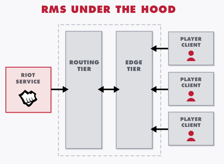 RMS itself has been designed as a global service - although technically it can follow League of Legends’ sharding model, it is game-agnostic, and can handle multiple shards at once. It's also a fundamental messaging layer that's meant to be used by almost all backend player-facing services, so it has to be robust. We went to great lengths to make sure RMS is reliable, fast, scalable, and deployable with 0 downtime (more on that later).