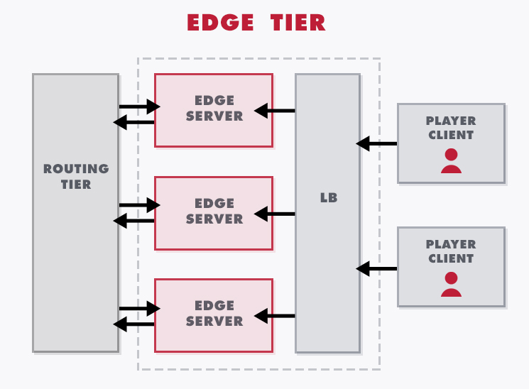 The RMS Edge (RMSE) tier is a collection of independent servers responsible for hosting player client connections. League clients connect to an RMSE node sitting behind a load balancer using an encrypted WebSocket connection. The connection is established after successful authentication, persists throughout the player’s session, and is terminated on logout.