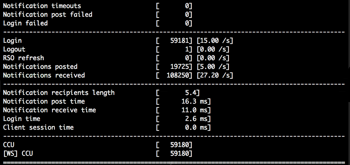 The Load Test Tool is also linearly scalable: each instance can hold ~60k active RMS connections (thanks to exhausting the ~2^16 - 1 number of TCP ports, less those reserved for system services), and we can grow the CCU by increasing the number of Load Test Tool boxes.