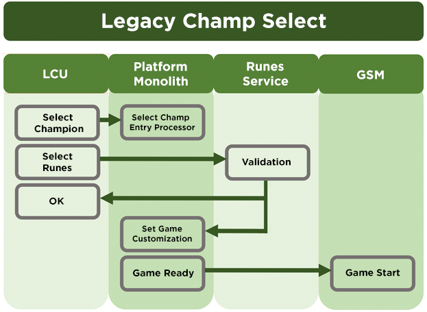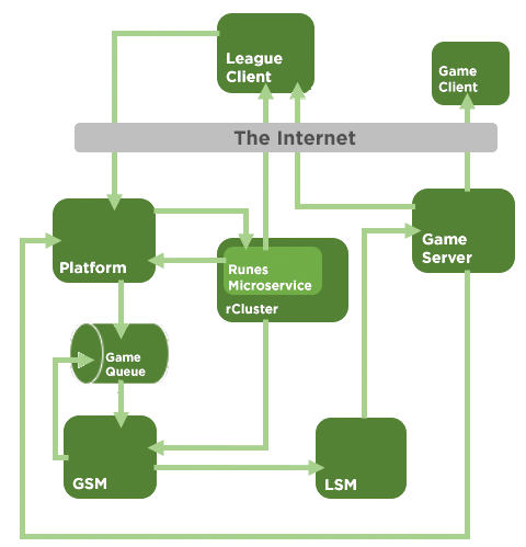 Each of these runes and masteries were designated with a unique ID value, stored in a SQL database accessed by “the Platform” - a large, monolithic service that houses a large number of components, including ones responsible for starting games.