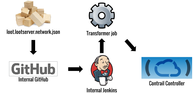 When an engineer changes this configuration in GitHub, a transformer job runs and makes API calls in Contrail to create and update policies for their application’s private network.