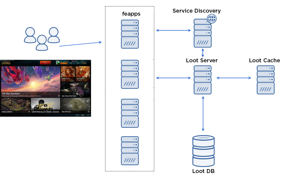 The feapp looks up the Loot Service in “Service Discovery” to find its IP and port information.