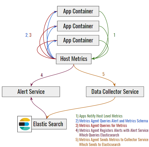 The metrics system can query an app for its metrics payload and absorb that data into the metrics pipeline, retrieving and then pushing the metrics to our data collectors located in every datacenter. Data is then forwarded to an Elasticsearch storage engine, where registered watchers assist in triggering alerts.