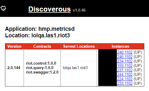 After a new application starts, it seeks out the discovery service to find out where the configuration service lives, a process I detail below. It’s important that the app configures itself before executing the next step: registering itself in Discovery. This allows other services to find and query the new service as well as learn about the contracts it serves. Here’s an example of how one of our metrics services reports for one of our QA environments: