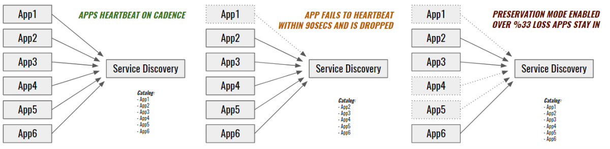We handle these cases with a simple heartbeat pattern. Services that fail to call back in the allotted time are assumed M.I.A. and dropped from discovery. However, things may not be so straightforward in a production environment. If something goes terribly wrong in the datacenter, the system needs a basic level of awareness to react appropriately. If discovery notices that a large number of its registered clients stop heartbeating, it can assert that there is some kind of mass network or communication failure and fall into "preservation" mode. In preservation mode, discovery retains its data and immediately pages an operator, thus helping to protect us from various registration storms or the ever popular "network blip."