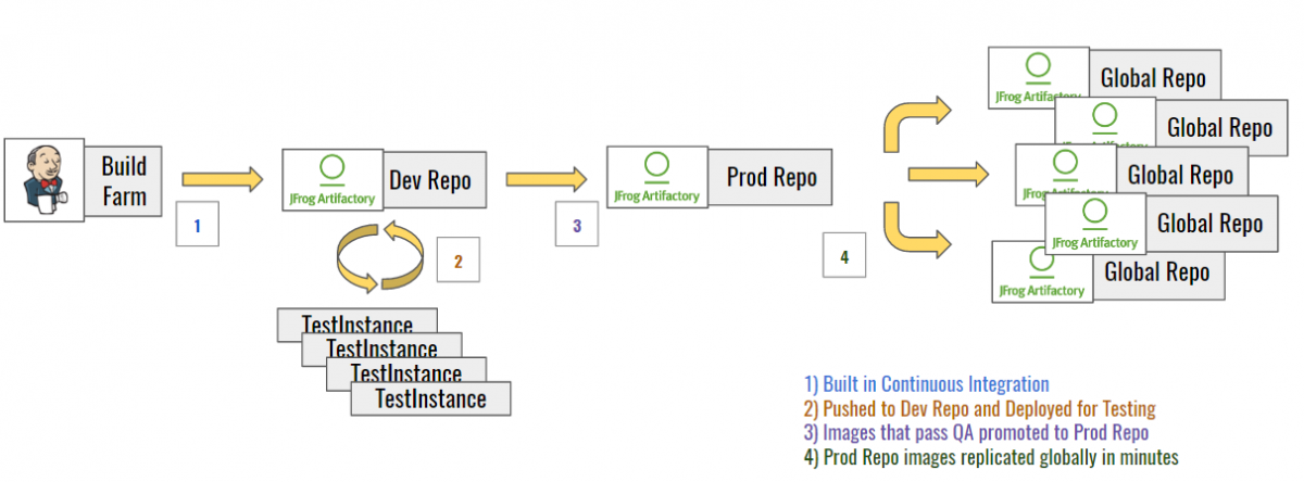 We achieve this goal by hosting our own globally-replicated docker registry, leveraging the power and capability of JFrog’s Artifactory. The diagram below shows the production lifecycle of a built container image: