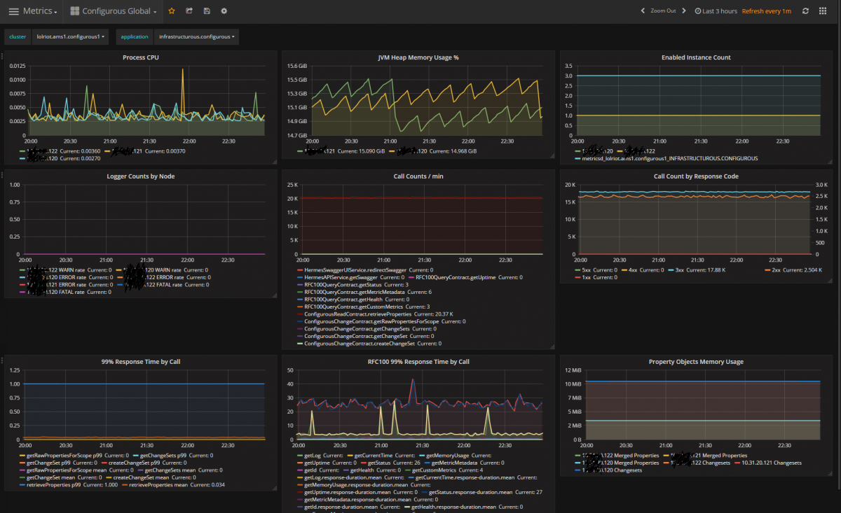 This is a capture of the metrics from our configuration service. It’s not every metric, but it’s a nice sample. You can see its CPU load (really light) and that it receives around 20,000 requests a minute. This particular instance is from our Amsterdam datacenter - its "cluster" is "lolriot.ams1.configurous1" (the deployment scope) and the application is "infrastructurous.configurous" (its application scope).