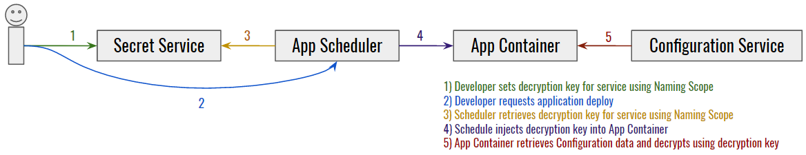To use this is simple in theory. Developers place service-specific decryption keys into the secret service using the application naming scope. Our container scheduler, Admiral, then injects keys into application containers when they start (looking them up by naming scope). Once an application container has its decryption key, it can decrypt configuration properties it has retrieved from the configuration service. The owner of the service’s configuration needs to use the encryption key to encrypt the data before pushing it to the configuration store.